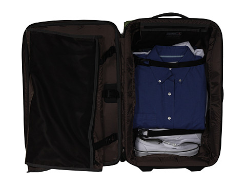 This 22" deluxe expandable wheeled travel bag features a main storage area with hanging mesh zippered pocket on the inside wall for small accessories and compression straps to keep folded items in place.